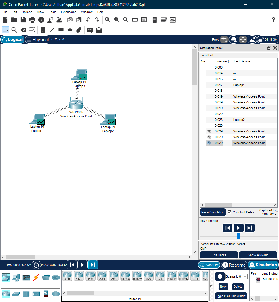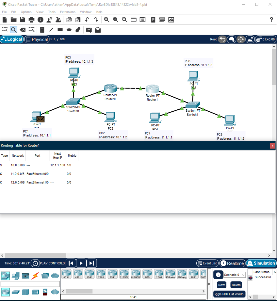 Below are some screenshots of Packet Tracer where I simulated networks to learn, practice, and test networking concepts. I use this program for practice quite often, but I did these last year. This project, in particular, helped me visualize the networking concepts I learned in class. This practice helped reinforce my understanding of how data travels across various networks. It helped me learn how the smallest misconfiguration could disrupt a network from working correctly, along with the importance of paying attention to detail. Finally, it grew my love for the intricacies of networking and confidence in finding their flaws.